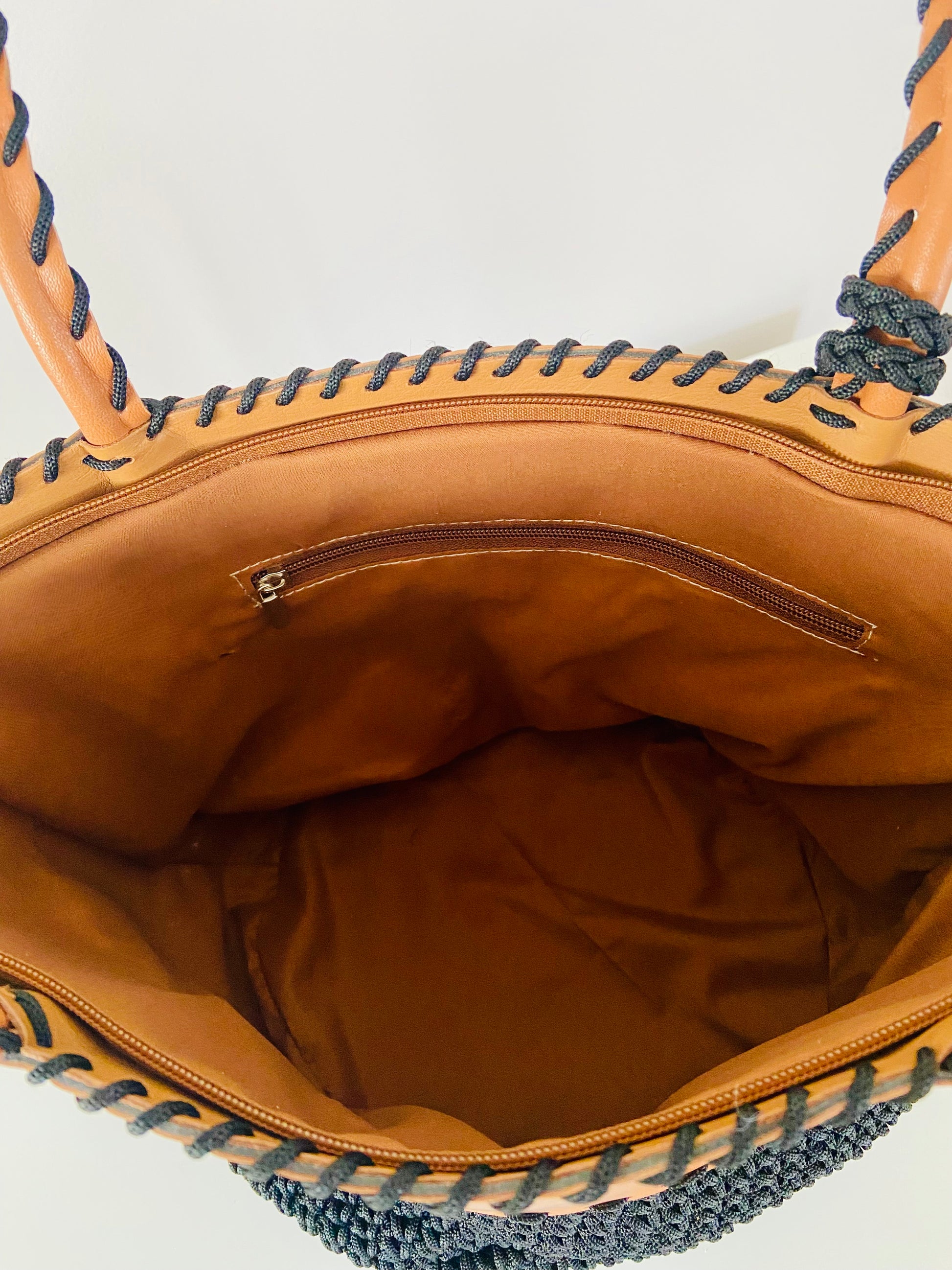 Emportez élégamment vos effets personnels dans ce joli sac entièrement fabriqué à la main au Maroc, en cuir et cordelette tressée en acrylique et coton. C'est un accessoire qui allie tradition et modernité tout en s'accordant à tous les styles. Moderne et chic, il est refermable grâce à sa fermeture éclair et possède une poche intérieure zippée. Ses anses rondes en cuir permettent de le porter à l'épaule ou à la main.